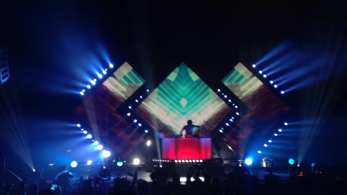 For the tour, which supports his brand new, #1 album, Adventure, Madeon has built a stage rig to rival the most famous setups of EDM stars like Feed Meand Sub Focus. The stage itself, all angles with diamond structure surrounding the DJ, seems to invoke Daft Punk‘s unparalleled Alive 2007 rig. In fact, it’s clear that Daft Punk is this fellow French producer’s biggest artistic influence, from his funky electro-house sound, to the live triggering that makes up the backbone of his show. There was a moment where I was sure he was going to drop “Robot Rock,” and, as the video below makes clear, some of the lighting effects on his rig seemed to be a direct homage to the androids’ Alive tour (compare to footage of Daft Punk’s live “Television Rules the Nation/Crescendolls” mashup).