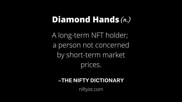 Diamond hands is a term for someone who plans to hold onto an NFT long-term, with no concern about market conditions in the short term. The opposite of paper hands.